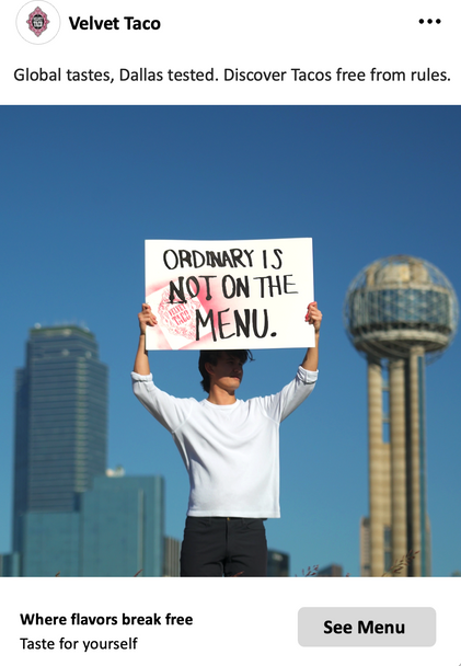 Chicken tikka masala belongs in a taco, fight me. Or fight Velvet Taco. They're the ones breaking culinary rules for your benefit. We created a scrappy social campaign that called on Dallasites to let their palettes off their leashes. At the end of the day, DFW outperformed all of Velvet Taco's other markets after previously lagging behind.